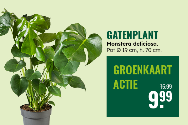 Met Jouw groenkaart kun je deze mooie gatenplant met extra voordeel kopen. Heb je nog geen groenkaart, waardoor je deze prachtige plant niet met korting kunt kopen? Haal de kaart dan snel op in jouw GroenRijk vestiging of download de app en maak zelf een digitale groenkaart aan. Hier kun je zien welke GroenRijk vestiging het dichtst bij je in de buurt is.
