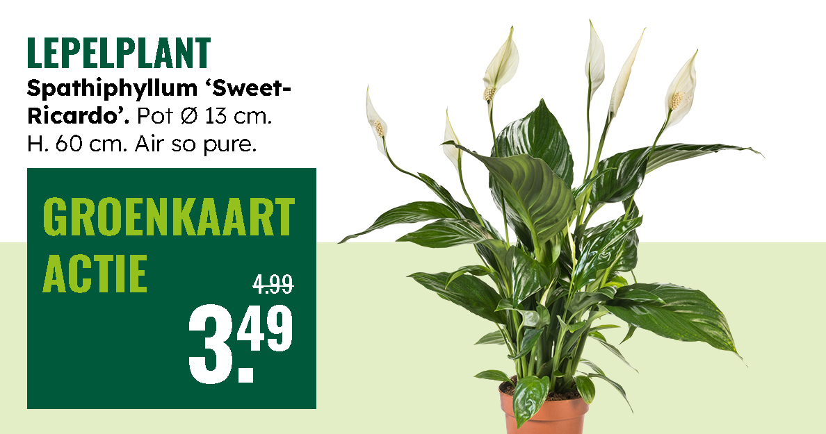 Met Jouw groenkaart kun je deze mooie lepelplant met extra voordeel kopen. Heb je nog geen groenkaart, waardoor je deze prachtige plant niet met korting kunt kopen? Haal de kaart dan snel op in jouw GroenRijk vestiging of download de app en maak zelf een digitale groenkaart aan. Hier kun je zien welke GroenRijk vestiging het dichtst bij je in de buurt is.