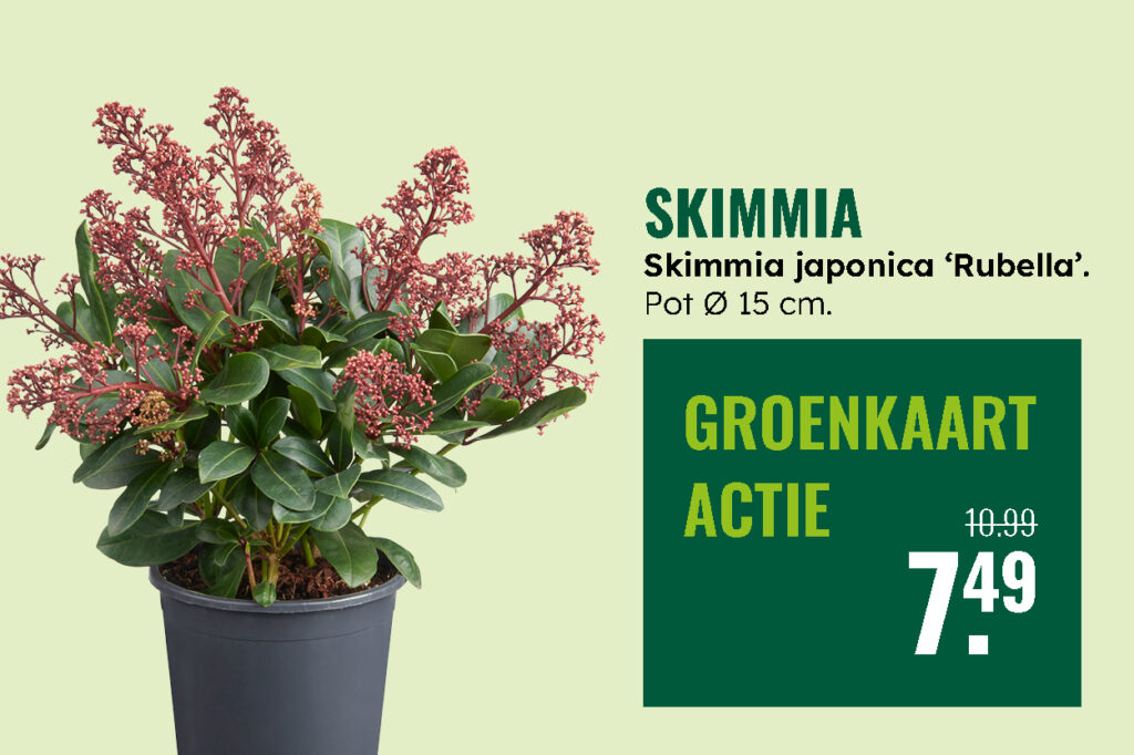 Je kunt weer extra profiteren met Jouw groenkaart. Wij zetten regelmatig een mooie plant in het zonnetje, welke jij met je groenkaart met extra korting kunt bemachtigen. Voor deze week is dat de Skimmia! De aanbieding is geldig van woensdag 3 t/m dinsdag 9 december 2025.