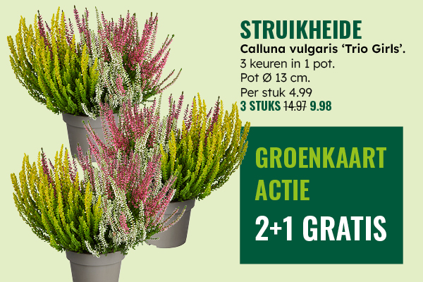Je kunt weer extra profiteren met Jouw groenkaart. Wij zetten regelmatig een mooie plant in het zonnetje, welke jij met je groenkaart met extra korting kunt bemachtigen. Voor deze week is dat een struikheide ! De aanbieding is geldig van woensdag 1 t/m dinsdag 7 oktober.
