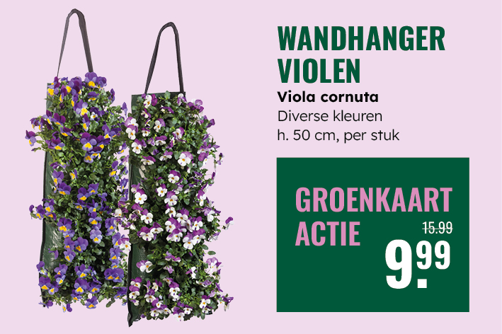Je kunt weer extra profiteren met Jouw groenkaart. Wij zetten regelmatig een mooie plant in het zonnetje, welke jij met je groenkaart met extra korting kunt bemachtigen. Voor deze week is dat het een wandhanger met violen!